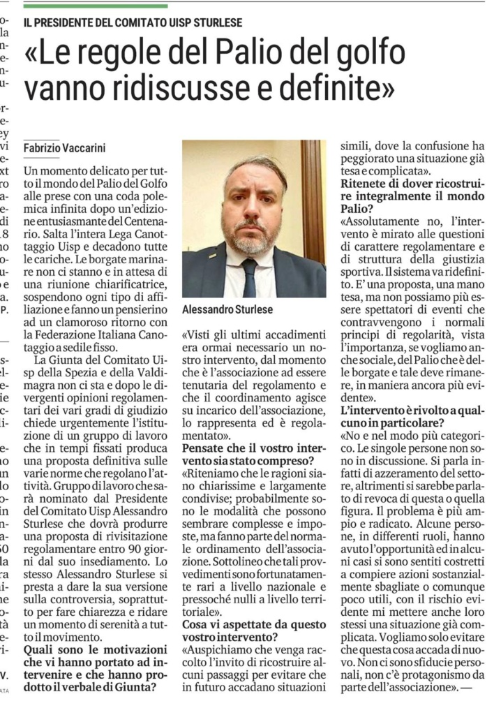 “Le regole del Palio del golfo vanno ridiscusse e definite”Di Comitato delle Borgate / 28/09/2025 Il Secolo XIX, 28 settembre 2025 Articoli correlati Comune e borgata ai ferri corti. Venere Azzurra ancora nel mirino 2025 Un Palio di polemiche. Finanziamenti al Comitato “Non torniamo indietro” 2025 “Gianello soltanto indagato. Il Comune non si intromette” 2025 Palio del Golfo numero 100 è la storia del nostro popolo 2025
