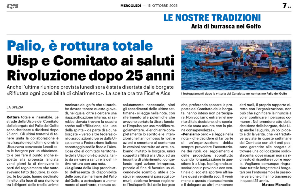Palio, è rottura totale. Uisp e Comitato ai saluti. Rivoluzione dopo 25 anniDi Comitato delle Borgate / 15/10/2025 La Nazione, 15 ottobre 2025 Articoli correlati Comune e borgata ai ferri corti. Venere Azzurra ancora nel mirino 2025 Un Palio di polemiche. Finanziamenti al Comitato “Non torniamo indietro” 2025 “Gianello soltanto indagato. Il Comune non si intromette” 2025 Palio del Golfo numero 100 è la storia del nostro popolo 2025