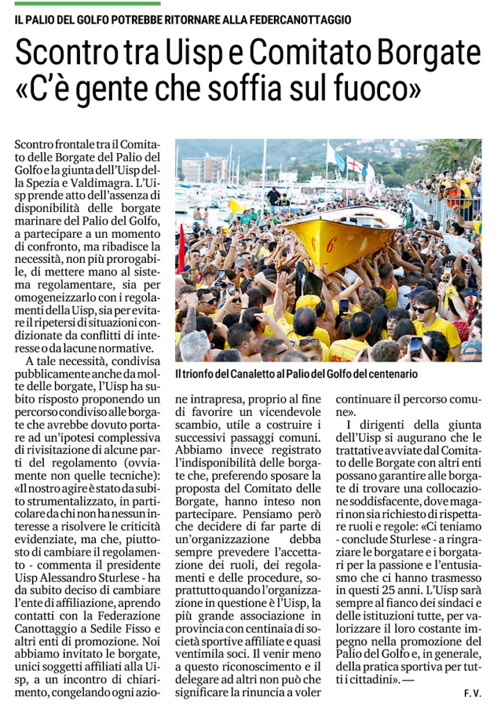 Scontro tra Uisp e Comitato Borgate “C’è gente che soffia sul fuoco”Di Comitato delle Borgate / 15/10/2025 Il Secolo XIX, 15 ottobre 2025 Articoli correlati Comune e borgata ai ferri corti. Venere Azzurra ancora nel mirino 2025 Un Palio di polemiche. Finanziamenti al Comitato “Non torniamo indietro” 2025 “Gianello soltanto indagato. Il Comune non si intromette” 2025 Palio del Golfo numero 100 è la storia del nostro popolo 2025