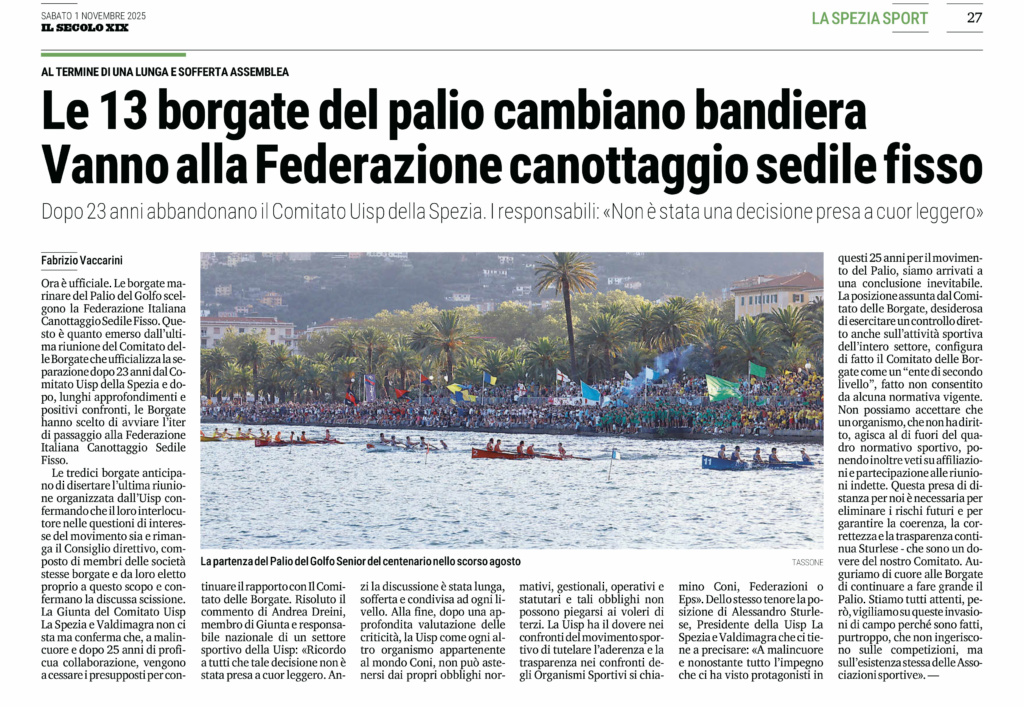 Le 13 borgate del palio cambiano bandiera. Vanno alla Federazione canottaggio sedile fissoDi Comitato delle Borgate / 01/11/2025 Il Secolo XIX, 02 novembre 2025 Articoli correlati Comune e borgata ai ferri corti. Venere Azzurra ancora nel mirino 2025 Un Palio di polemiche. Finanziamenti al Comitato “Non torniamo indietro” 2025 “Gianello soltanto indagato. Il Comune non si intromette” 2025 Palio del Golfo numero 100 è la storia del nostro popolo 2025