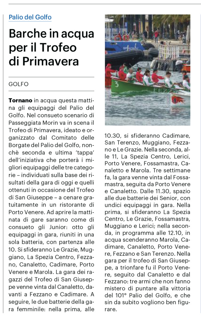 Barche in acqua per il Trofeo di PrimaveraDi Comitato delle Borgate / 19/04/2026 La Nazione, 19 aprile 2026 Articoli correlati Il Palio ritrova il gonfalone junior. Gara in Federazione canottaggio 2026 Le nostre tradizioni. Verso la sfida remiera. 2026 Domani il Trofeo di San Giuseppe. Si torna in mare 2026 Trofeo di San Giuseppe, oggi si torna a vogare 2026